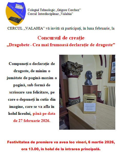Publicat pe ianuarie 25, 2026CONCURS DE CREAȚIE „DRAGOBETE – CEA MAI FRUMOASĂ DECLARAȚIE DE DRAGOSTE”